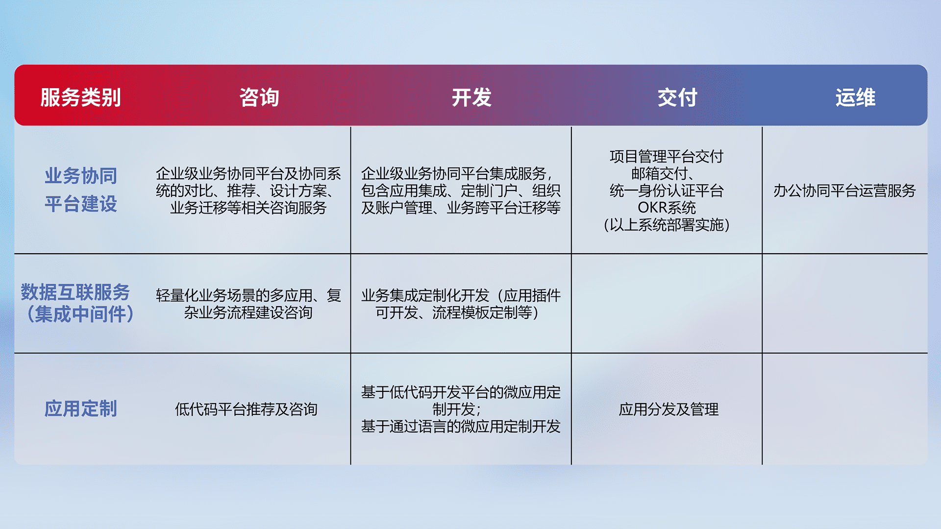 针对钉钉、、、、企微、、、、IDaas等平台级产品提供产品的规划、、、、方案、、交付、、定制化开发等服务,,实现如统一协同办公、、、、智能客户服务、、、、混合会议管理、、、智能数据查询、、、、等业务场景,,,,实现数字化转型。。