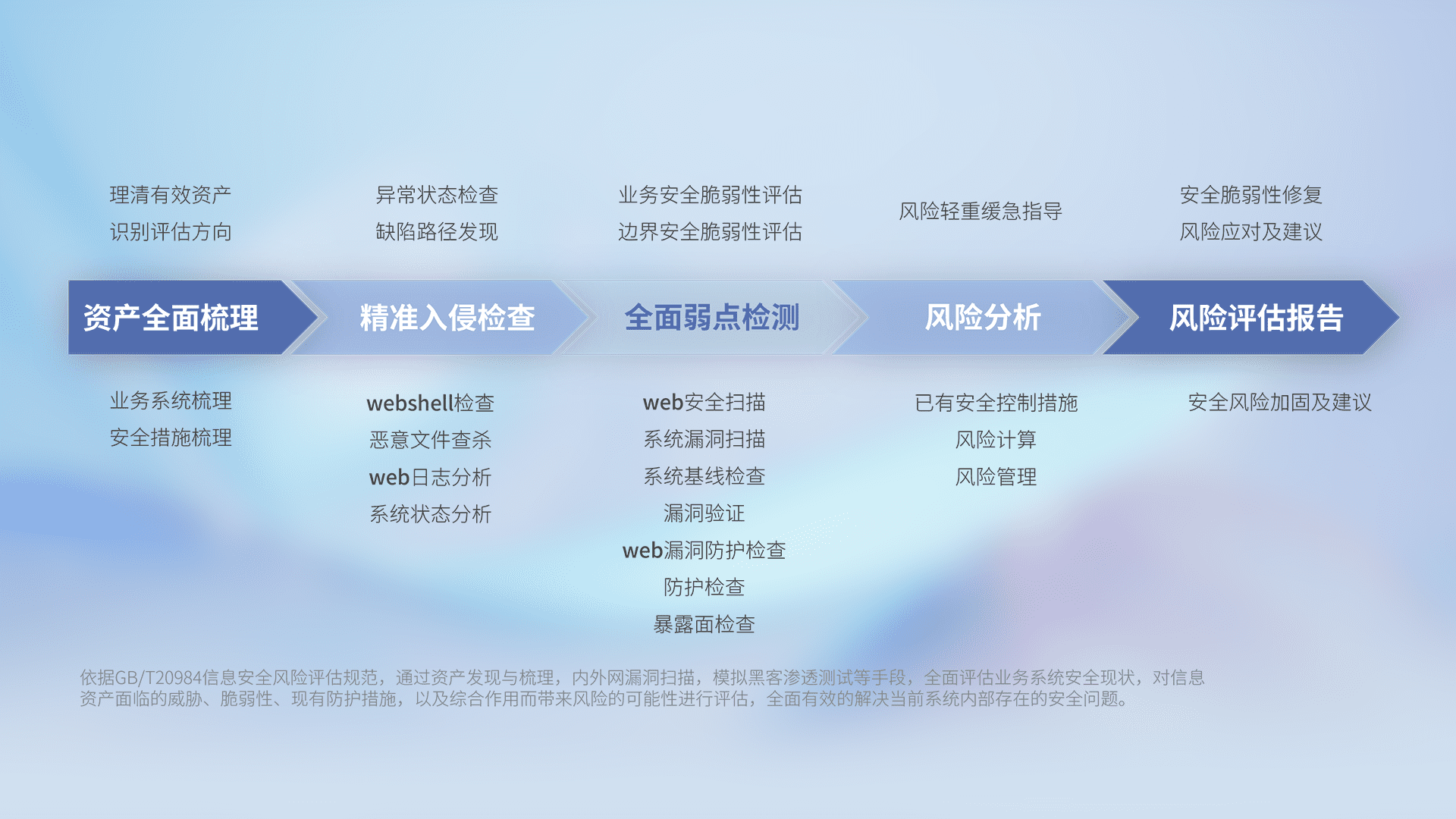 针对客户行业特性,,以专业的安全服务+多厂商联合解决方案提供专属的一站式安全管理服务,,,帮助客户全面感知网络空间威胁,,,基于识别、、、、检测、、、分析、、防护、、监测、、、、响应的服务理论模型,,,,从方案咨询、、集成交付、、、、评估验证、、、、优化加固、、、、运维运营,,,,致力于为客户提供完整的闭环管理式安全服务。。。以实战经验为客户打造高抵御风险的安全体系,,帮助客户发现威胁、、、、对抗威胁、、处置威胁,,不断积累安全对抗能力,,,持续保障数字化安全。。。